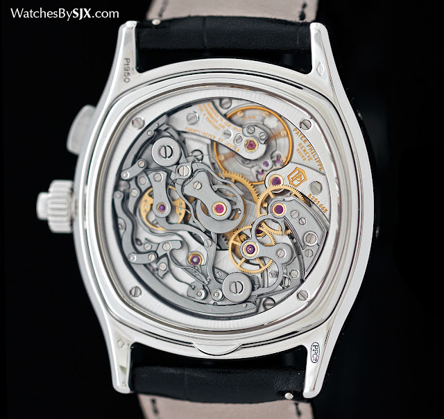 De zwarte is een schijf van massief goud, gelakt een glanzend zwart en bedekt met toegepaste Breguet cijfers in wit goud. Het is fijn gemaakt, en relatief leesbaar voor een dergelijk complex wijzerplaat. Maar zoals met veel chronografen, de belangrijkste attractie is het omgekeerde. Het kaliber CHR 27-525 PS Q is gewoon geweldig om naar te kijken. Zonder eeuwigdurende kalender mechanisme (zoals gevonden in ref. 7059 , 5959 en 5950), de CHR 27 de dunste split-seconde chronograaf beweging van vandaag.